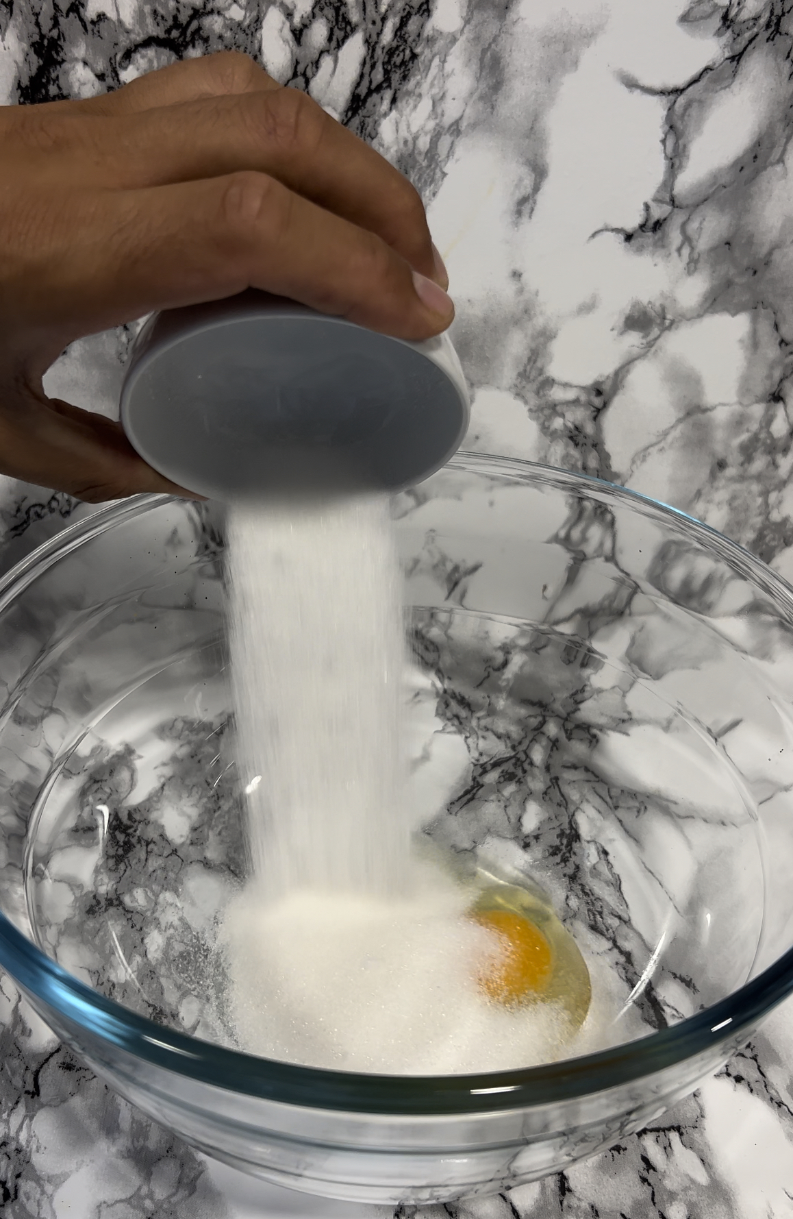 - En un cuenco pon el huevo y el azúcar. Bátelo todo con una varilla.