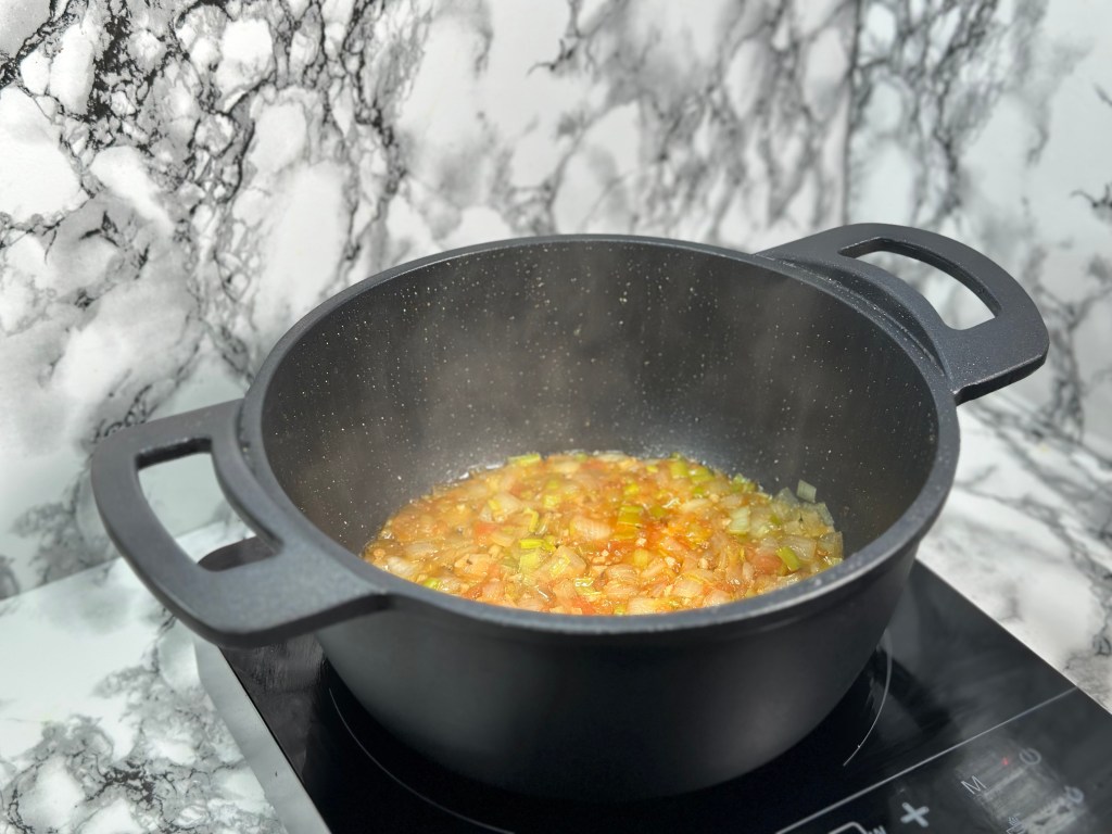 - Pochamos el ajo, la cebolla y el puerro.