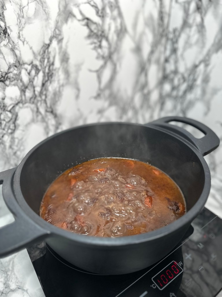 - Poner el vino tinto y el caldo. Cocinar a fuego lento una hora y media.