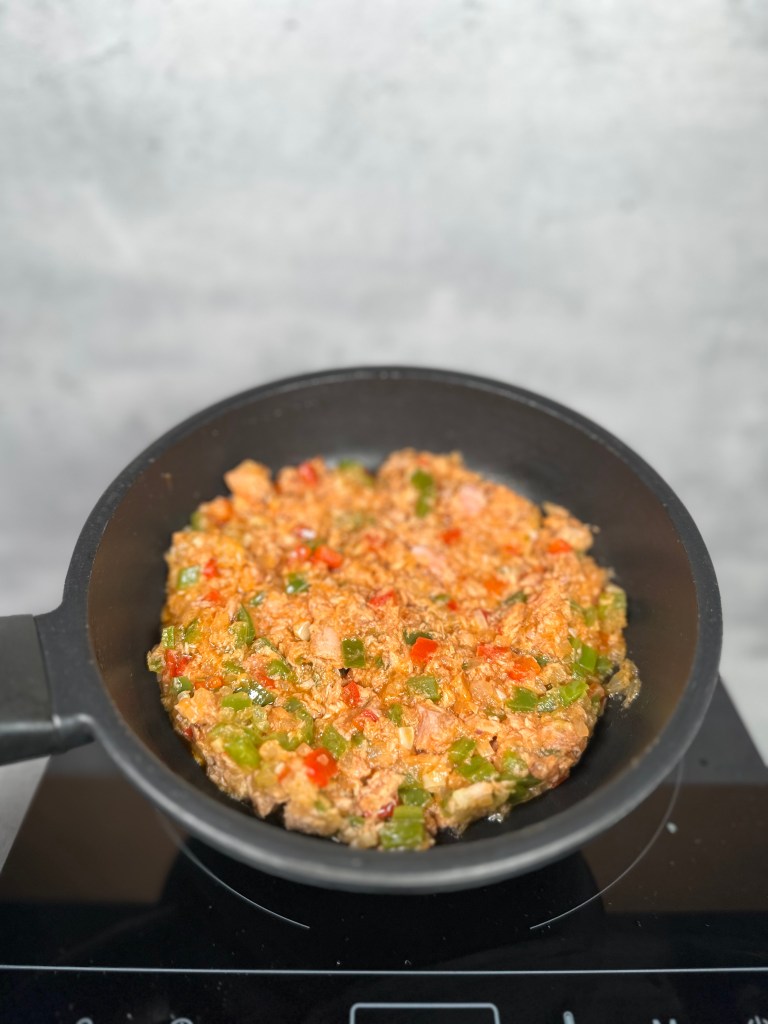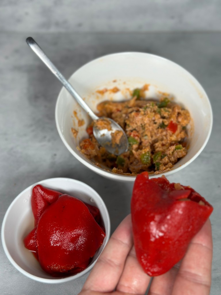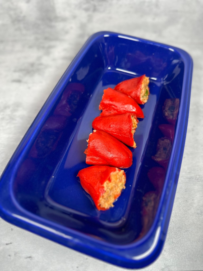 - Rellenar los pimientos con el sofrito de atún y colocarlos en una bandeja de horno.