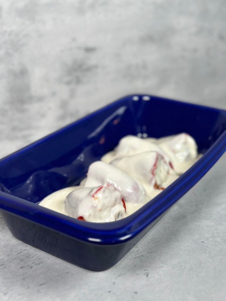 - Si eres fan del queso puedes poner un poco de queso encima de la bechamel antes de meter los pimientos rellenos en el horno.