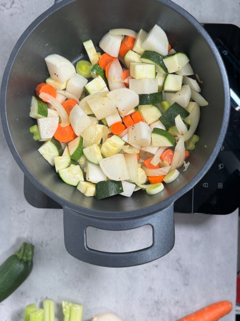 - Rehogamos unos minutos y ponemos la zanahoria, el apio y el nabo.