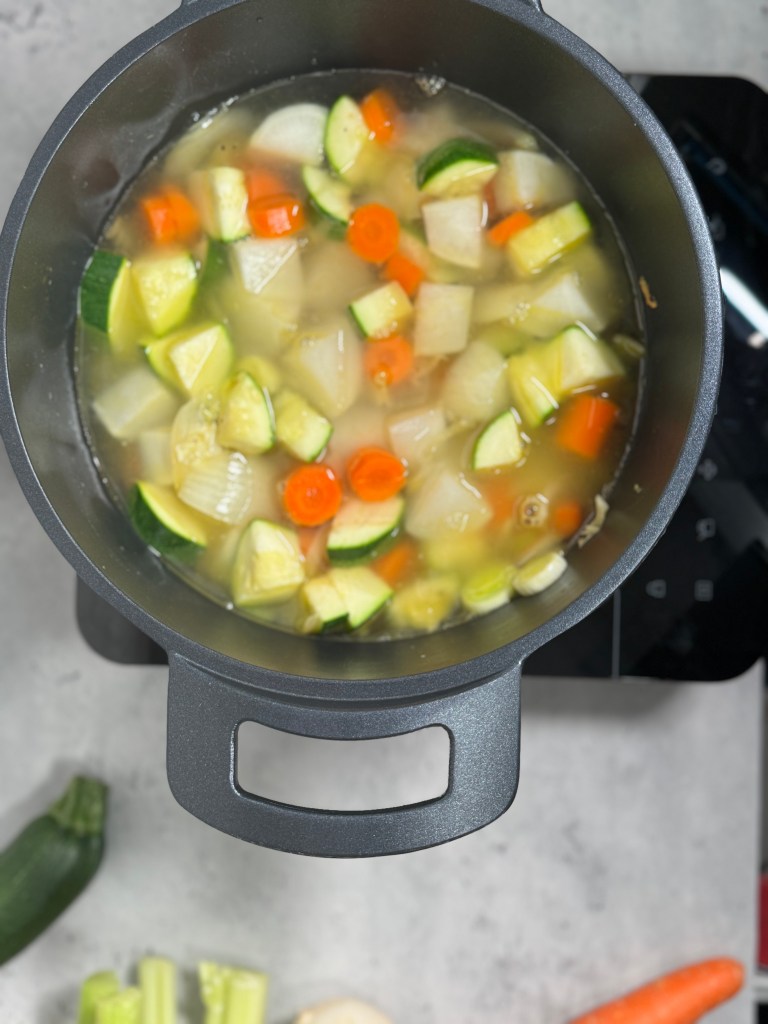 - Por último añadimos el calabacín y dejamos pochar la verdura unos 10 minutos.