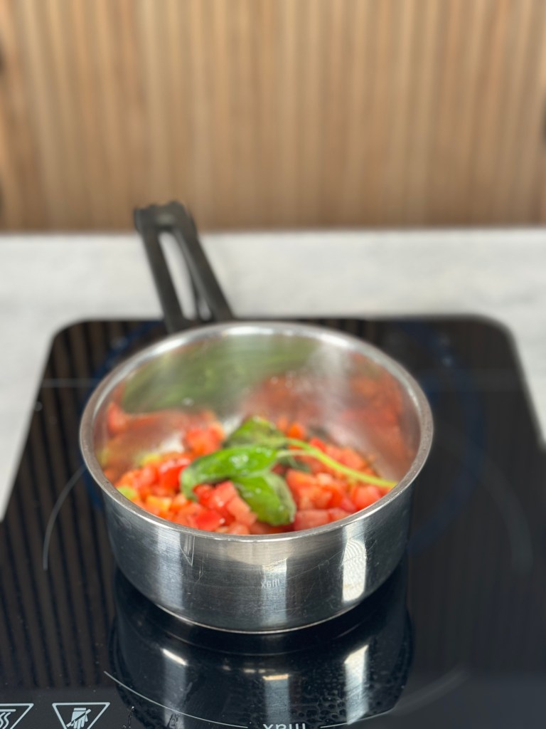 - En una olla, calentar un poco de aceite y sofreír los ajetes tiernos picados junto con el tomate en dados y las hojas de albahaca.