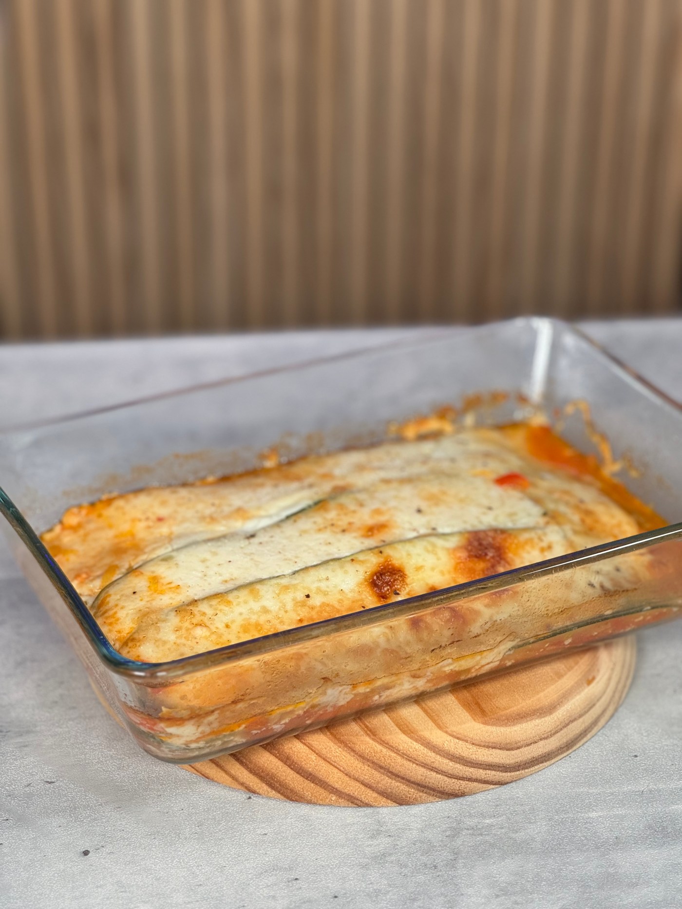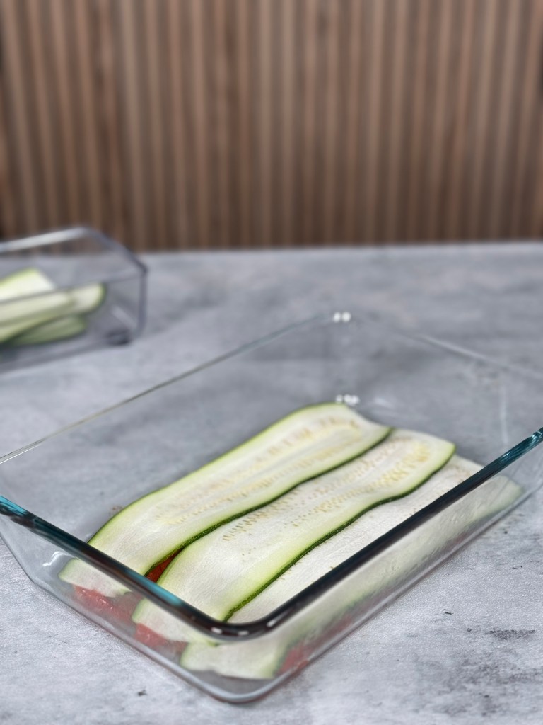 - En una bandeja apta para horno, poner una capa del sofrito de tomate en el fondo y cubrir con unas láminas de calabacín.