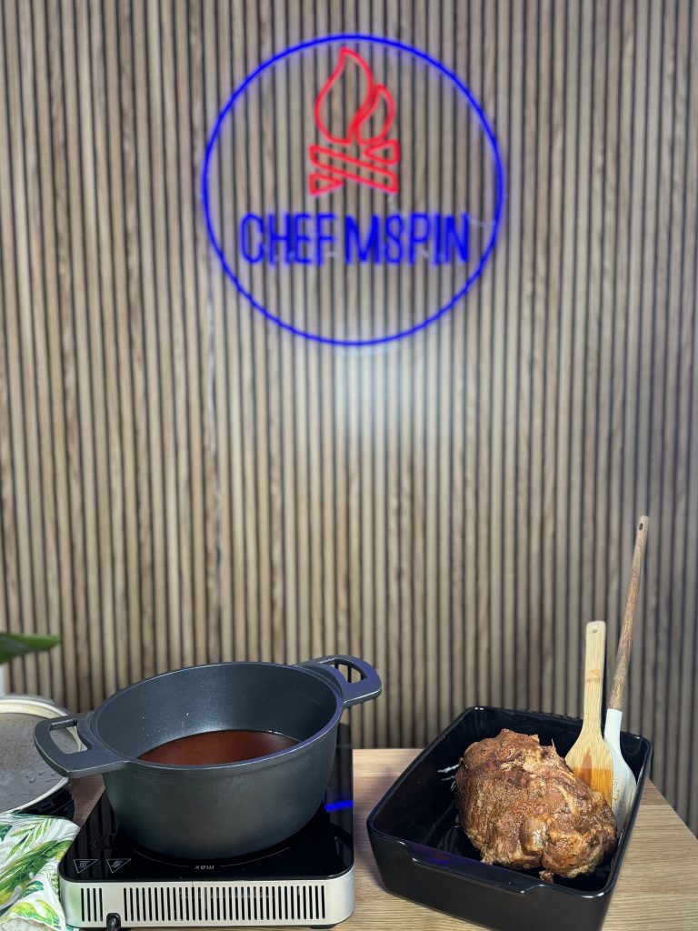- Vierte el vinagre de manzana y el caldo de carne, cubriendo la carne.